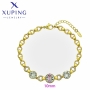 Această brățară aurie de la Xuping Jewelry impresionează prin designul său elegant și sofisticat. Brățara este formată dintr-o serie de legături circulare interconectate, unele dintre ele având mici bile aurii. Partea centrală a brățării include setări circulare mai mari, cu pietre clare fațetate, fiecare având un diametru de 10 mm. Brățara este prevăzută cu un lanț ajustabil și o închizătoare tip lobster pentru confort și siguranță. Această brățară este perfectă pentru a adăuga un plus de strălucire și rafinament oricărei ținute, fie pentru evenimente speciale, fie pentru purtarea zilnică.